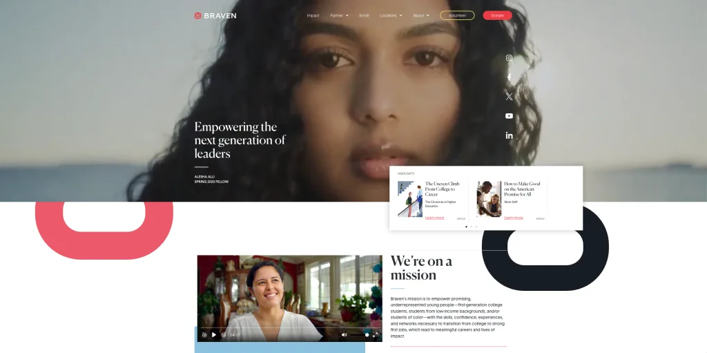 When you think of a strong branded website, this Braven site is high on the list. Modern, clean, full of great messaging and great content. It makes you want to scroll and check out more of the site. From strong color schemes to leaning in heavy with their mission statement and trust building stats. Though they have multiple colors in their color scheme, they use white space and also use a shade of gray to break everything up. Perfect use of icons, imagery and text, making this one of my favorite sites on the list.